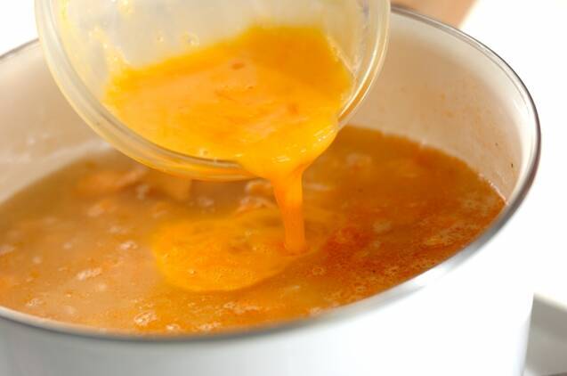 煮たつ直前に溶いた卵をまわし入れて火を止め、蓋をする。卵がふんわりしたら器に盛り分け、万能ネギを散らす。