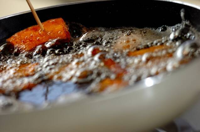 フライパンにカボチャと常温の揚げ油をかぶる位入れて中火で熱し、竹串がスッと刺さるようになったら取り出す。