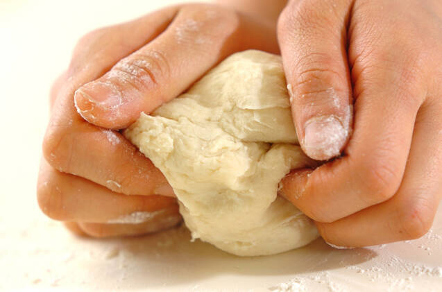 成形する。打ち粉をした台の上に生地を出してひとつにまとめ、4等分にして丸めてとじ目を閉じ、かたく絞った布巾を上にかけて20分間生地を休ませる(ベンチタイム)。