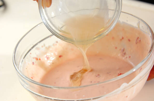 (1)に(2)を加えて手早くかくはんし、<ケーキ台>を敷いた流し型に流し入れ、冷蔵庫で1時間以上冷やしかためる。かたまったら食べやすい大きさに切り分けて器に盛り、<飾り>のイチゴ、ミントの葉を飾る。