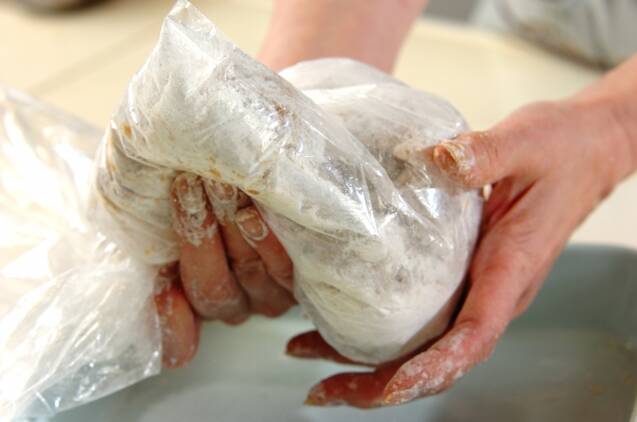 鶏手羽元の汁気を軽くきり、<揚げ用衣>を全体にからめる。