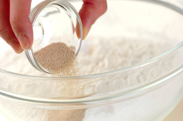ボウルに強力粉、インスタントドライイースト、砂糖、塩を入れる。