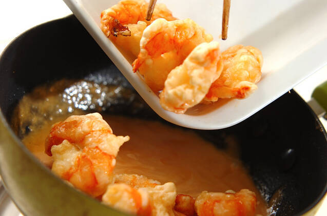 (2)のフライパンの揚げ油を空け、サッと水洗いして水気を拭き取る。<オーロラソース>のレモン汁、塩を入れて中火にかけ、塩が溶けたら他の材料を加えて混ぜ合わせる。ソースが温まったら火を止め、エビを戻し入れて全体にからめる。
