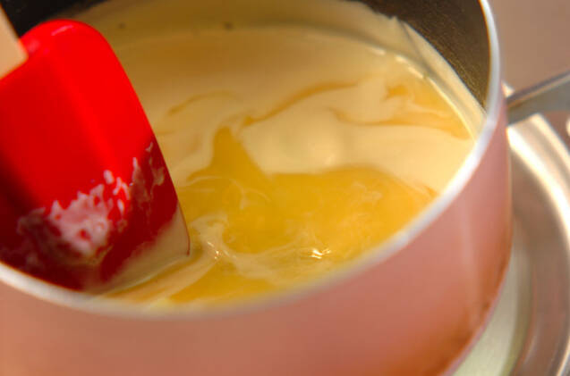 牛乳の半量を沸騰直前まで温め、(1)のボウルに少しずつ加えて混ぜ合わせる。鍋にもどし、混ぜながら弱火で熱し、トロミがつくまで温める。