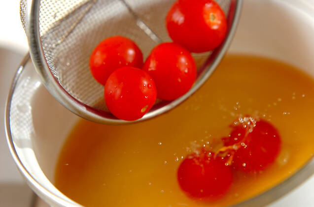 鍋に<スープ>の材料を入れて中火にかけ、顆粒スープの素が煮溶けたらプチトマト、ミックスベジタブルを加える。