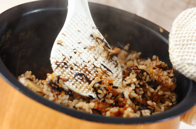 炊き上がったら、シャモジで炊飯器とご飯の間に隙間を作るように1周し、底から持ち上げてほぐしながら余分な水分を飛ばす。
