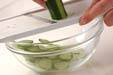 キュウリは縦しま目に皮をむいて、輪切りにし、塩少々でもむ。しんなりしたら水洗いして水気を絞っておく。