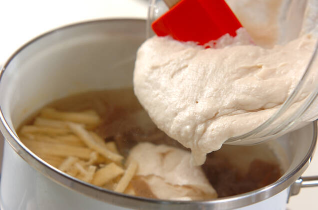 (1)の鍋に板コンニャク、油揚げ、(2)の酒粕をだしごと加えて全体に混ざるまで煮る。