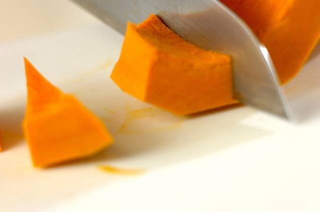 <カボチャクリーム>を作る。カボチャは種とワタ、皮を取り除いてひとくち大に切る。耐熱容器に入れてラップをし、電子レンジで柔らかくなるまで3~5分加熱する。