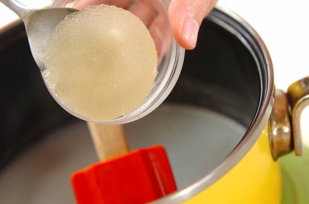ふやかしたゼラチンを加えて余熱で溶かし、鍋底を氷水にあてて粗熱を取る。