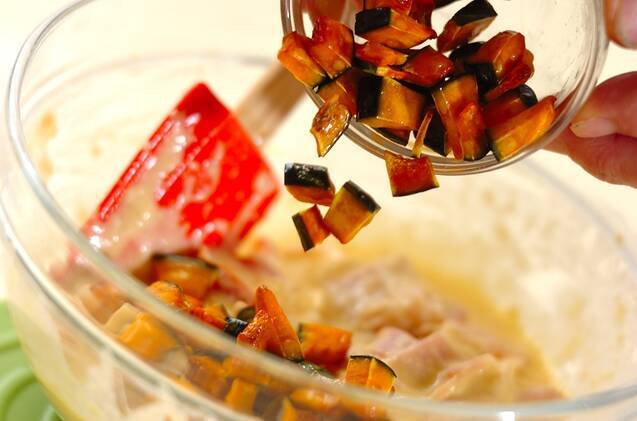 (3)のボウルにEVオリーブ油、粉チーズ、グリュイエールチーズ、ベーコン、干しカボチャ、サツマイモ、干しプチトマト、オレガノを加えて混ぜ合わせる。