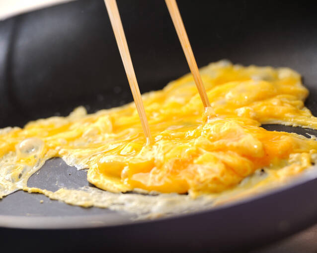 フライパンにサラダ油を熱して卵液を一気に入れ、菜ばしで大きく円を描くように混ぜ、半熟にしていったん取り出す。