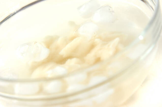 沸騰した湯の中に(1)をひとくち大にまるめて入れ、4~5分ゆでる。浮き上がってきたら冷水に取り、粗熱を取る。