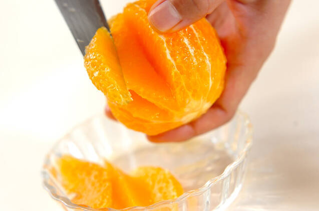 オレンジは包丁で皮をむき、1房分ずつ切り出す。飾り用に2房を別に残しておく。