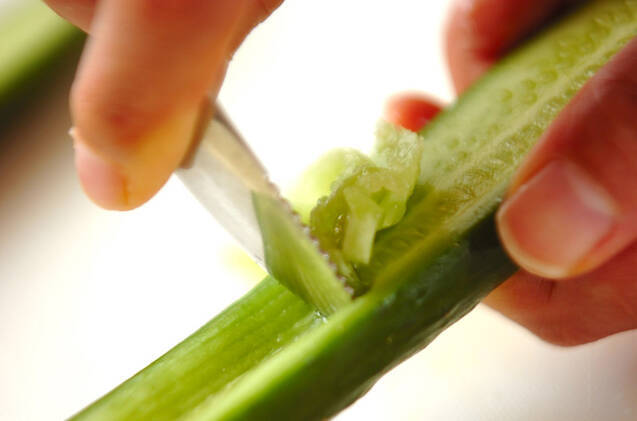 キュウリは両端を切り落として縦半分に切り、スプーン等で種をかき取り、幅2cmの斜め切りにする。