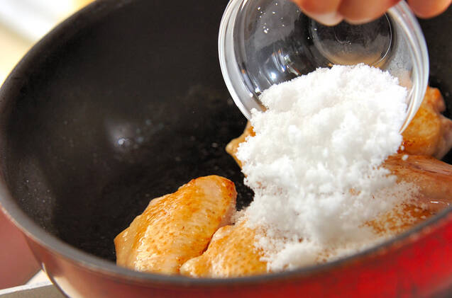 中華鍋に残りのサラダ油を入れて中火で熱し、鶏手羽先を加えて焼き色がついたら、<調味料>の砂糖を加え弱めの中火で、少し焦げるまで炒める。