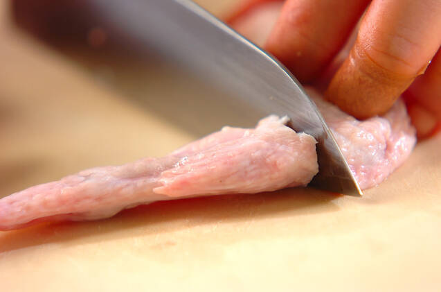 鶏手羽先は関節で切り離し、身の厚い部分に切り込みを入れ、小麦粉をからめる。