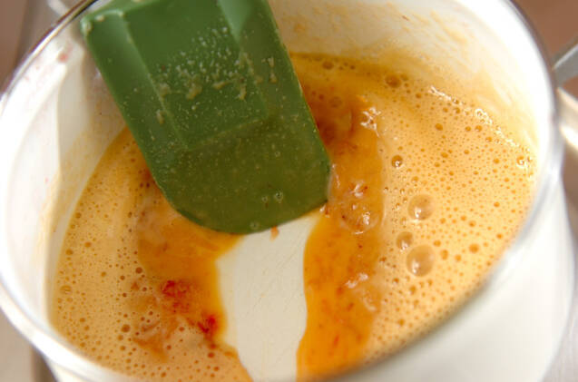 小鍋に戻し入れて弱火にかけ、トロミがつくまで混ぜながら煮る。火を止め、ふやかしたゼラチンを加えて溶かし、ボウルに移す。