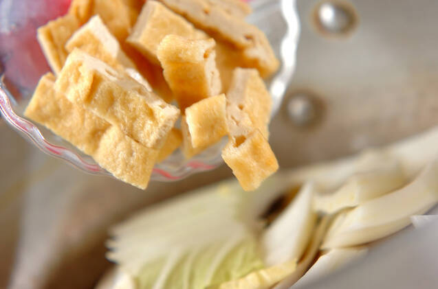 鍋にだし汁、<調味料>の材料を入れて火にかけ、煮立ったら水煮ゼンマイ、白菜の軸部分、油揚げを加え、落とし蓋をして3~4分中火で煮る。