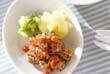 <ぱくぱく期>ハンバーグ、ブロッコリー、ジャガイモは7~8mmの大きさに切る、ケチャップ少々をつける。