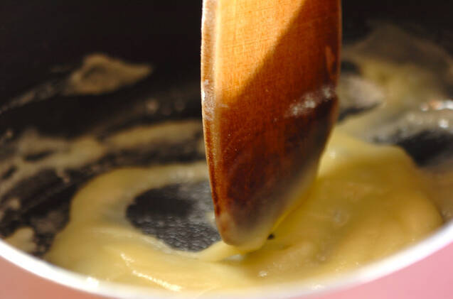 <ホワイトソース>を作る。鍋にバターを弱火で溶かし、小麦粉を炒める。焦がさない様に木ベラで混ぜながら、泡が細かくなったら冷たい牛乳を一気に加え、強火にしてダマにならない様に泡立て器でよく混ぜ合わせる。スキムミルクと生クリームを加え、塩コショウして少し火を弱め、トロリとするまで時々混ぜながら煮詰める。