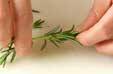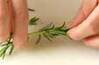 <ハーブパン粉>の生タイム、生ローズマリーは飾り用の枝を残し、軸から葉をしごき取る。ニンニクは縦半分に切って芽を取り、みじん切りにして他の材料と混ぜ合わせる。