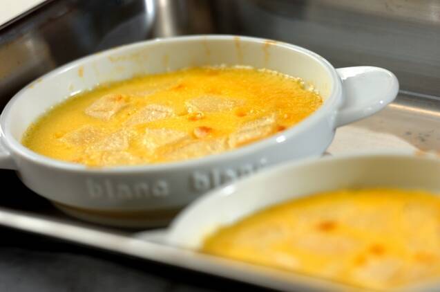オーブンの天板に(4)を並べて1cmほどお湯を注ぎ、160℃に予熱しておいたオーブンで約40分焼く。表面がかたまっていればOK。オーブンから出して冷ましておく。
