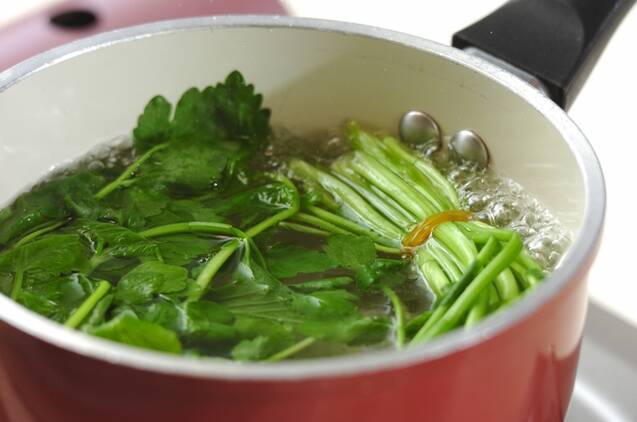 セリは根の部分を切り落とし、根元を輪ゴムなどでしばり、分量外の塩少々を入れた熱湯でサッとゆで、水に取る。水気を絞り、長さ2cmに切る。