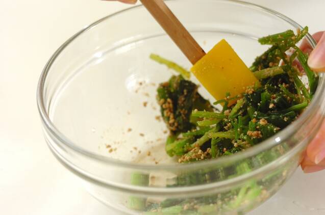 ボウルに<調味料>の材料を混ぜ合わせ、セリとすり白ゴマを入れて和え、器に盛る。