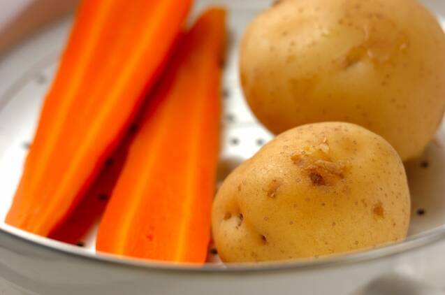 ジャガイモとニンジンは水洗いし、ニンジンは縦半分に切る。蒸し器に入れて強火にかけ、蒸気が出たら弱火にし、柔らかく蒸す。