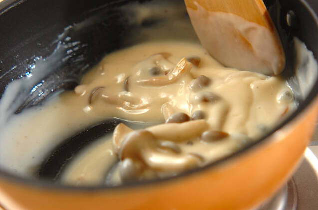 フライパンに分量外のサラダ油を中火で熱し、シメジをしんなりするまで炒め、塩コショウ、ホワイトソースを混ぜ合わせる。
