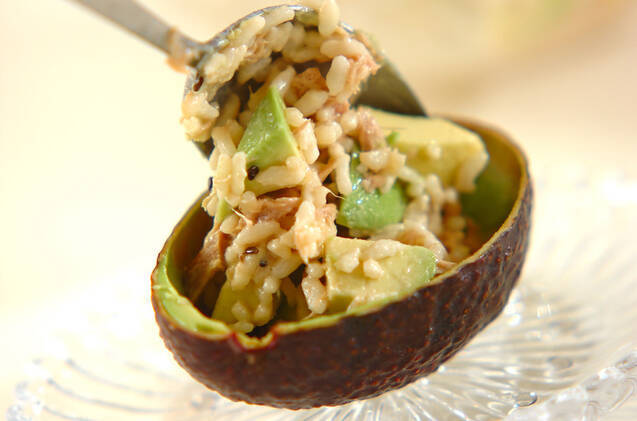 全ての材料を混ぜ合わせ、アボカドの皮に入れて器に盛る。