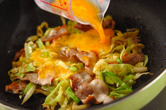 再びフライパンを中火で熱して(2)の半量を入れ、卵1個を軽く溶きほぐして全体にまわしかけ、お好みのかたさになったら器に盛る(同様にもう一回繰り返す)。