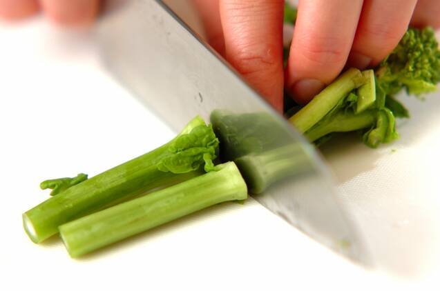 菜の花は根元を切り落とし、長さを半分に切る。ニンジンは皮をむき、薄切りにする。絹ごし豆腐は食べやすい大きさに切る。