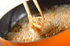 玉ネギは縦に薄切りにし、セロリは筋を引いて斜め薄切りに、ニンジンは皮をむいて縦細切りにし、一緒に<漬けダレ>につける。