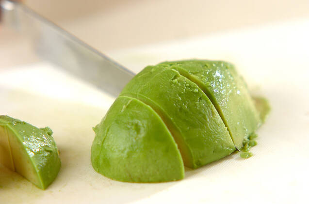 アボカドは包丁を縦に入れ、種まで深く切り込みを入れ、両手でひねるように半分に分け、種を取り、果肉をスプーンで取り出してひとくち大に切り、レモン汁と混ぜ合わせる。皮は器として使います。