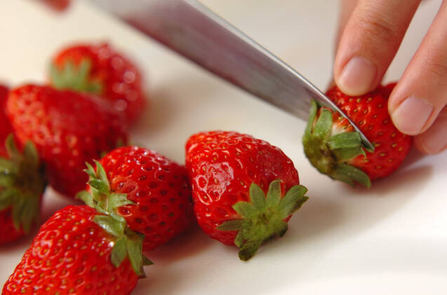 イチゴはヘタを取ってきれいに水洗いし、水気を拭き取る。粒が大きい場合は縦半分に切る。