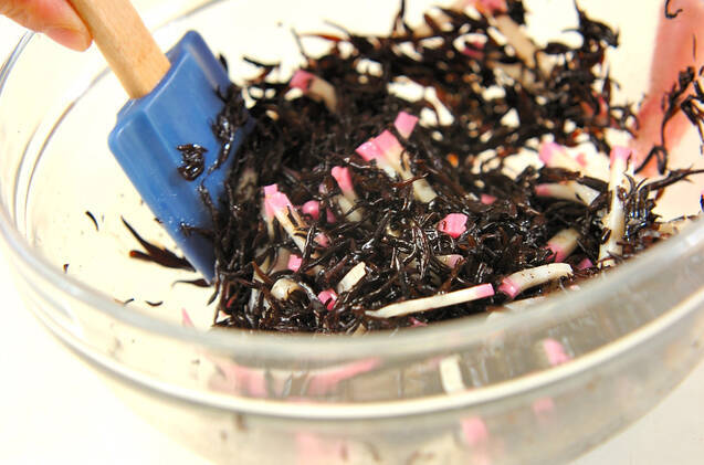 <調味料>のボウルに芽ヒジキとカマボコを入れて和え、器に盛る。