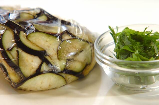 <ナスとシラスの和え物>ナスはヘタを切り落とし、縦半分に切り、幅5mmの半月切りにし、分量外の塩少々をもみ込む。大葉は軸を切り落とし、せん切りにする。