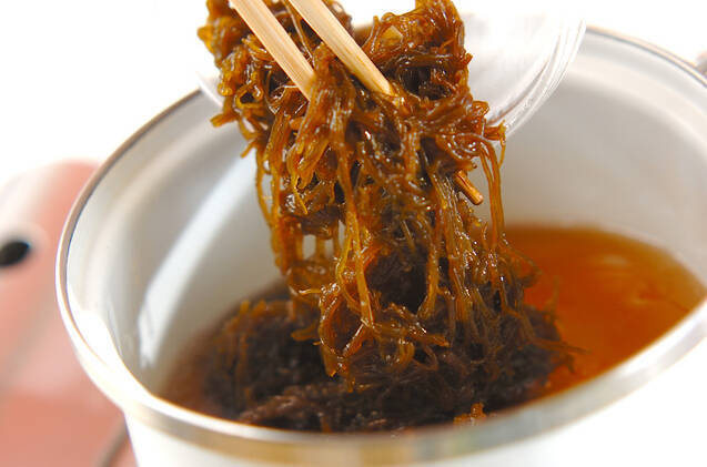 鍋にもずくを加えて混ぜ、バットなどに流し入れ、粗熱が取れたら冷蔵庫で冷やしかためる。器に盛り、ショウガをのせる。