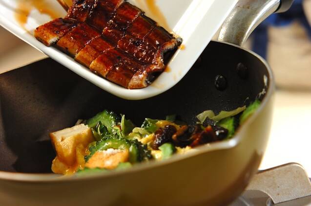 (1)に溶いた卵を加え火が通ったらウナギ蒲焼きと<調味液>の材料を加える。