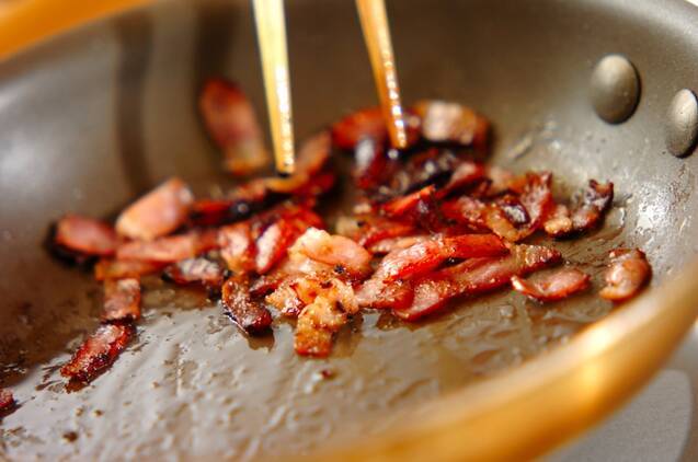 ベーコンを7mm位に切り、フッ素樹脂加工のフライパンでこんがりするまで炒める。