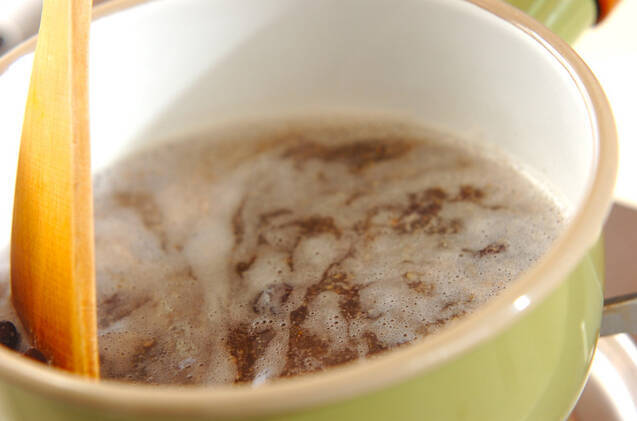 鍋にゆで小豆、水、塩を加えてひと煮たちさせ、すり白ゴマを混ぜ合わせる。