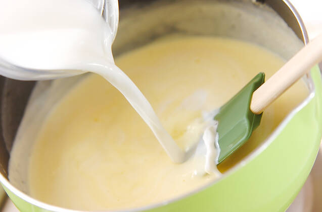2が温かいうちにふやかしたゼラチンを加えて溶かし、残りの牛乳を加える。鍋の底を氷水にあてながら、トロミがつくまで混ぜながら冷やす。