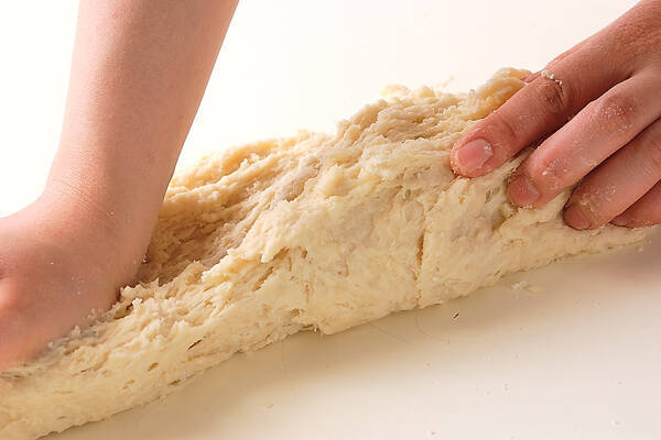 生地を作る。ボウルに強力粉とスキムミルク、塩を加え、泡立て器で混ぜ合わせる。砂糖、ぬるま湯で溶いたイースト、溶き卵を加え、カードで混ぜ合わせる。ひとまとめにしてカードを用いて台に移す。なめらかになるまでこねる。