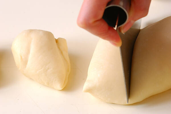 生地を1個60g(12個)に分割して丸める。ラップをして15分休ませる。(ベンチタイム)