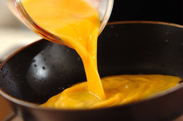 フライパンに分量外のサラダ油を薄くひき、中火にかける。フライパンが温まったら、卵液を一気に流し入れ、全体に薄く広げる。