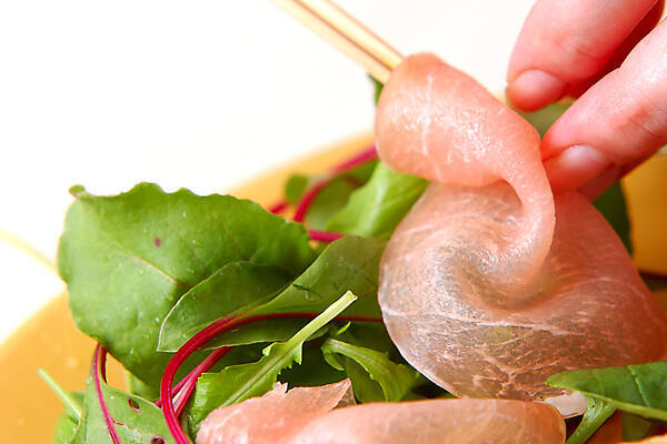 器にサラダ菜を敷き、ベビーリーフと【2】と生ハムを盛り合わせる。