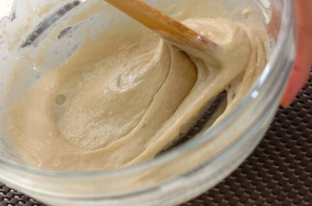 ボウルに分量の強力粉の1/3量と、インスタントドライイースト、砂糖を入れ、ぬるま湯を注ぐ。木ベラで2~3分、粘りがでるまで全体を混ぜ合わせる。