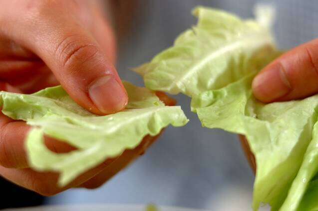 春キャベツは手でひとくち大にちぎる。熱湯に分量外の塩少々を加えて、春キャベツをサッとゆで、ザルに上げて水気をきる。